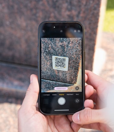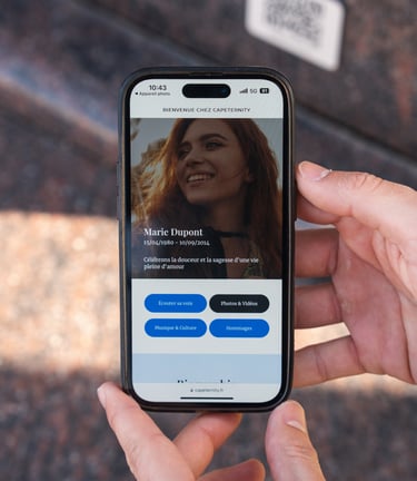 Chez CapEternity, notre mission est de perpétuer la mémoire de vos proches disparus à travers nos Médaillons. Nous offrons un hommage unique et personnalisé, en alliant tradition et innovation. Grâce à notre médaillon apposé sur le lieu de recueillement de votre choix (Pierre tombale, urne, columbarium, cavurne...), nous créons des pages web sur mesure, où chaque vie est racontée de manière authentique et significative.
